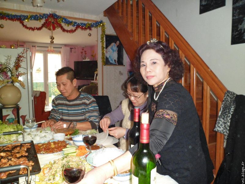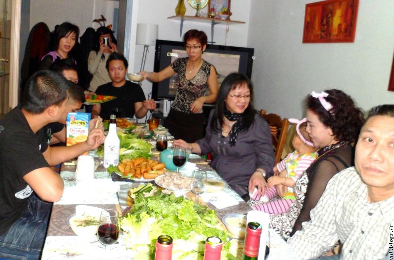 Au menu, soupe aux crabe, nems, salade de poulet, boeuf grillé, beignets de cuisse de grenouille,fruits, dessert, gâteau à la crème, champagne, vin rouge...